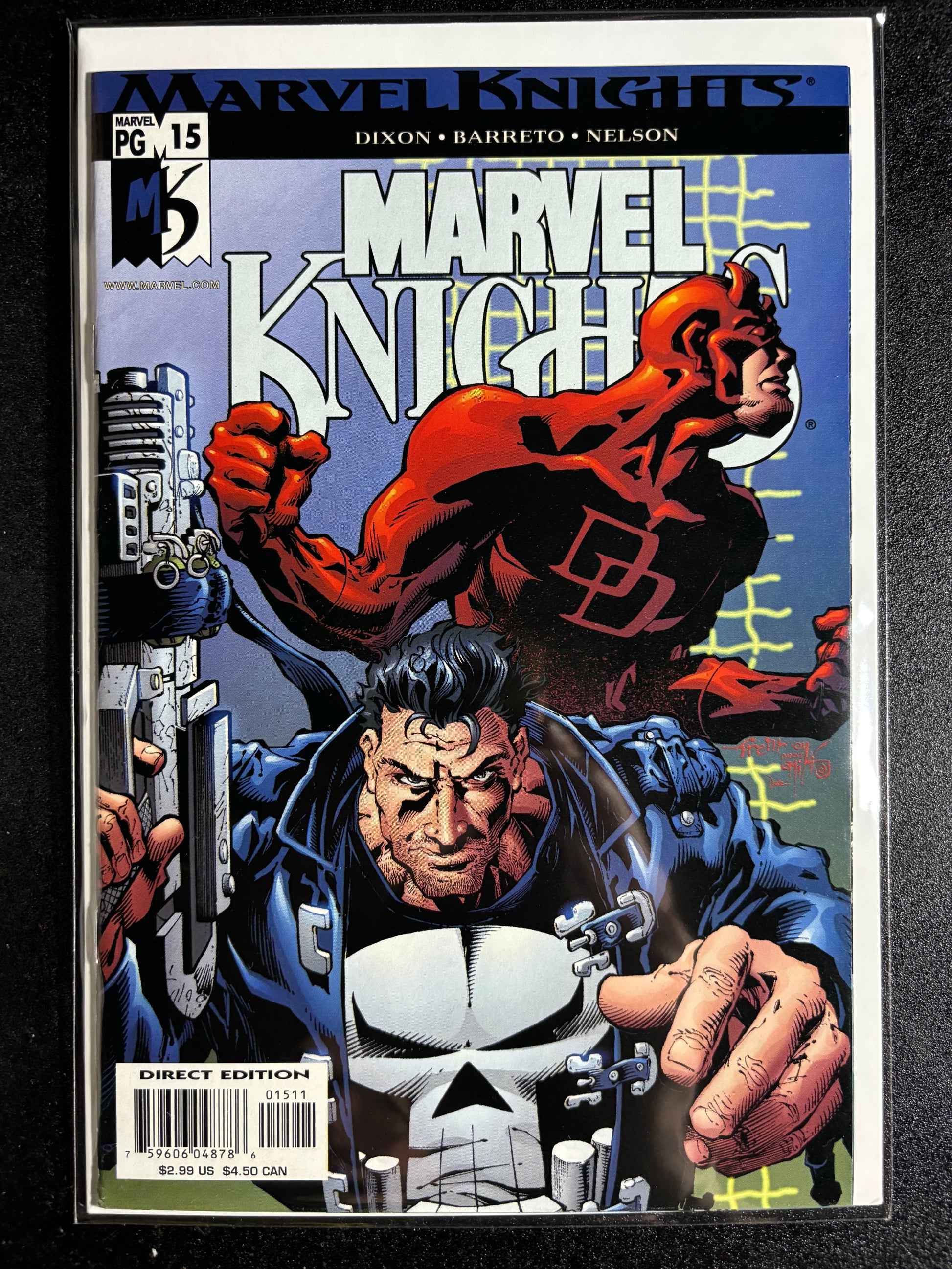 The streets run red in Marvel Knights issue #15, as Daredevil and the Punisher cross paths in a gritty urban showdown. Written by Chuck Dixon with art by Eduardo Barreto, this issue delivers hard-hitting action and tense moral conflict as two of Marvel’s most iconic vigilantes clash over justice, vengeance, and the line between them.